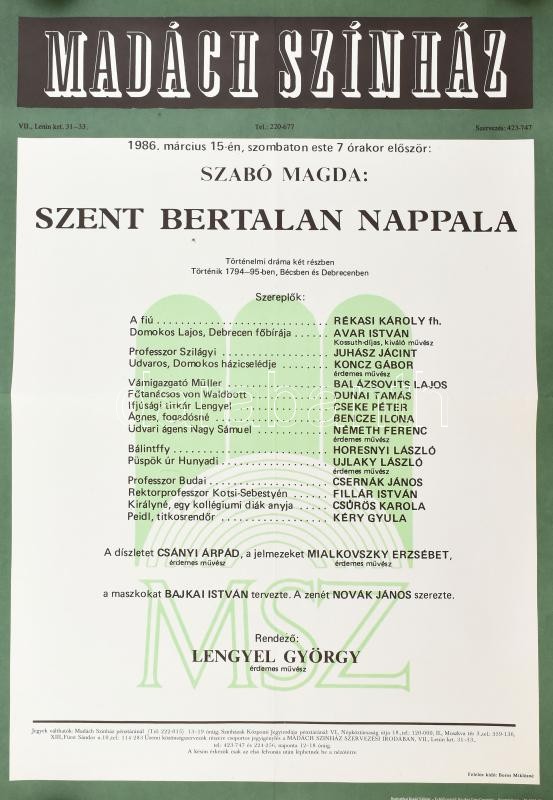 1986 Madách Színház, Szabó Magda: Szent Bertalan nappala előadás plakátja, feltekerve, 68,5x48 cm