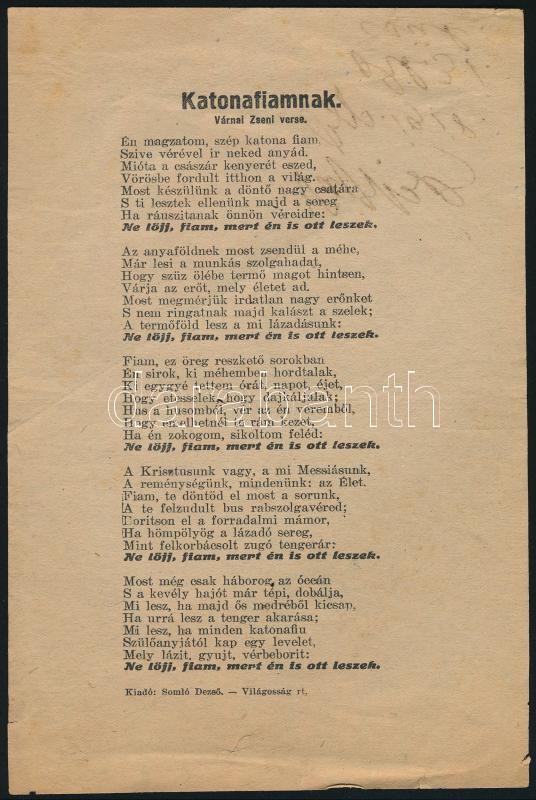 1918 Várnai Zseni "Katonafiamnak" című versének egyleveles nyomtatvány...