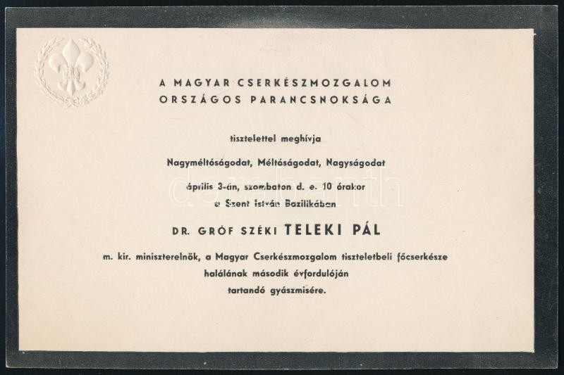 1943 Cserkészmeghívó Teleki Pál halála 2. évfordulója alkalmából