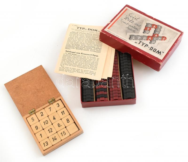 Typen-Domino szókirakó játék, német nyelvű leírással, komplett, eredeti dobozában + számjáték, fa dobozban, komplett
