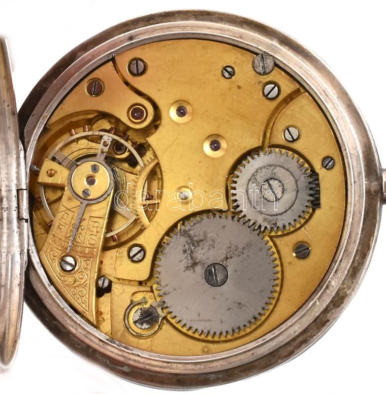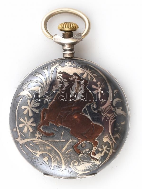 Tullius márkájú mechanikus férfi zsebóra, tula, aranyberakásos tokkal, fém számlappal, a tokon lovas férfi. cca 1910. Nem működik d: 50 mm