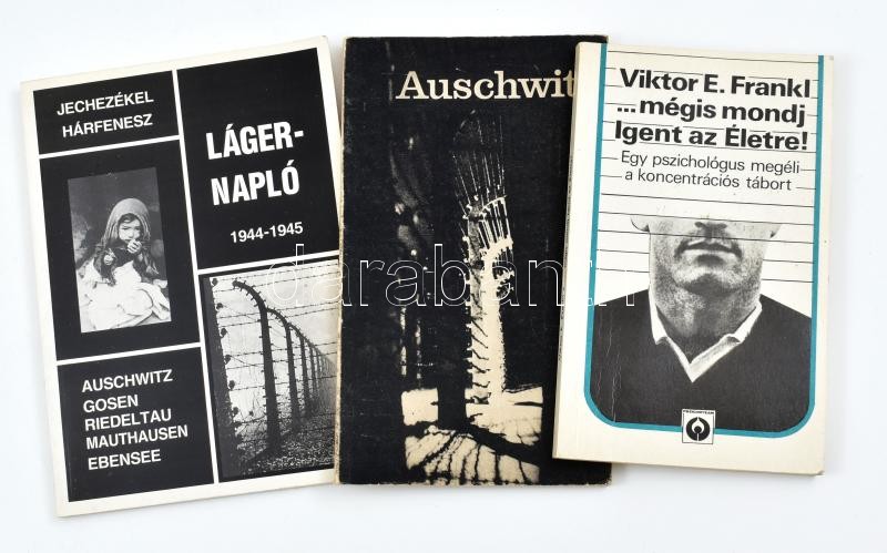 3 db holokauszt témájú kötet: Kazimierz Smolen: Auschwitz. (Oswiecim). 1940-1945. Oswiecim, 1966, Auschwitzi Múzeum. Kiadói papírkötés, kissé kopott, foltos borítóval. + Viktor E. Frankl: ...mégis mondj Igent az Életre! Egy pszichológus megéli a koncentrációs tábort. Bp., 1988, Pszichoteam Mentálhigénés Módszertani Központ. Kiadói papírkötés. + Jechezékel Hárfenesz: Lágernapló 1944-1945. (Auschwitz, Gosen, Riedeltau, Mathausen, Ebensee). Bp., 1993, Pesti Szalon. Kiadói papírkötés.