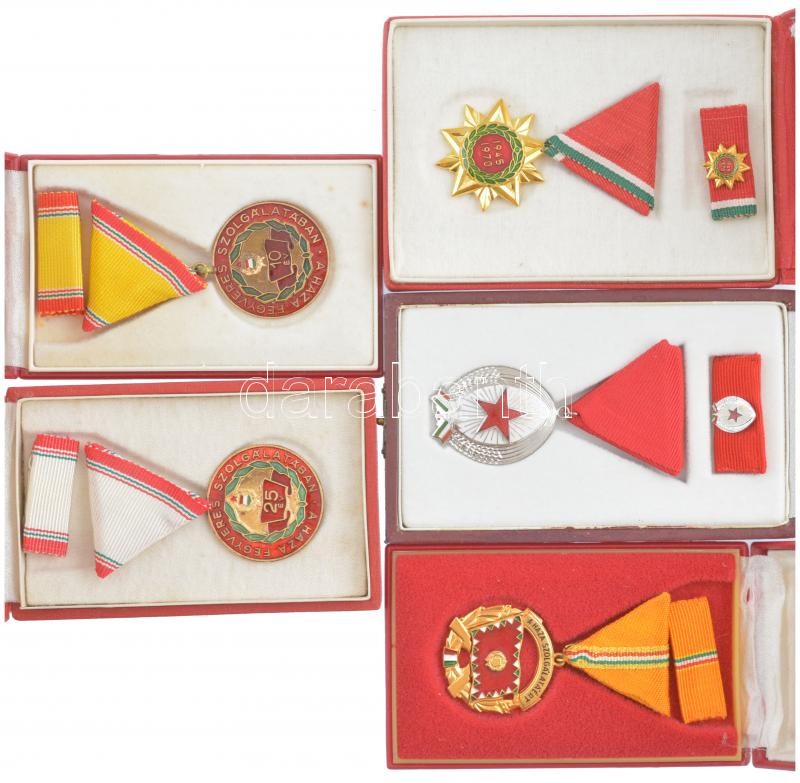 5db klf szocialista kitüntetés tokban, közte 1970. "Felszabadulási Jubileumi Emlékérem" aranyozott, zománcozott bronz kitüntetés mellszalagon, miniatűrrel, szalagsávval + 1983. "Munka Érdemrend" ezüst fokozata, ezüstözött, zománcozott Br kitüntetés mellszalagon, eredeti tokban T:1,1-