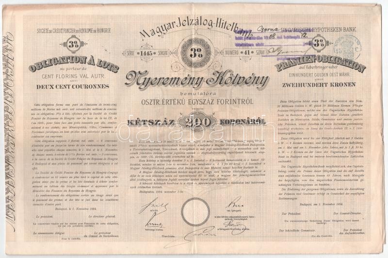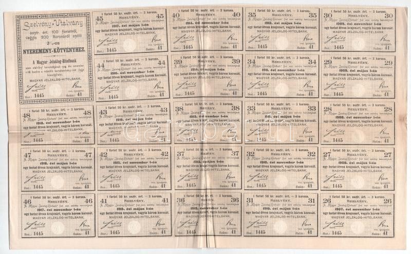 Budapest 1911. "Magyar Jelzálog Hitelbank" nyeremény-jegye szárazpecséttel és bélyegzéssel szelvényekkel T:III