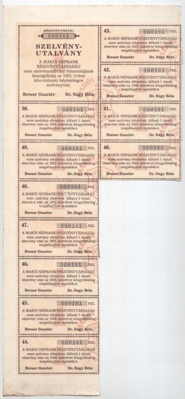 Makó 1929. "Makói Népbank Részvénytársaság" részvénye 50P-ről (2x), sorszámkövetők "000180 - 000181", szelvényekkel T:I-,II