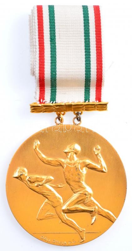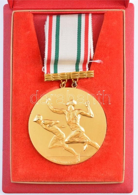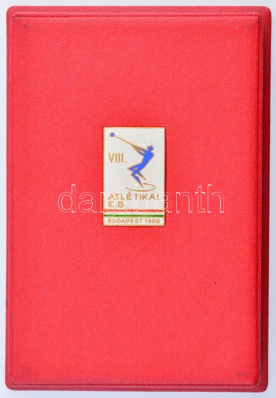 Description: Gáll Gyula (1939-) 1966. "VIII. Atlétikai Európa Bajnokság Budapest" aranyozott Ag díjérem nyakszalagon, eredeti tokban, a tokon az EB zománcozott fém logója rögzítve (~140g/0.925/70mm) T:1- kis ph.