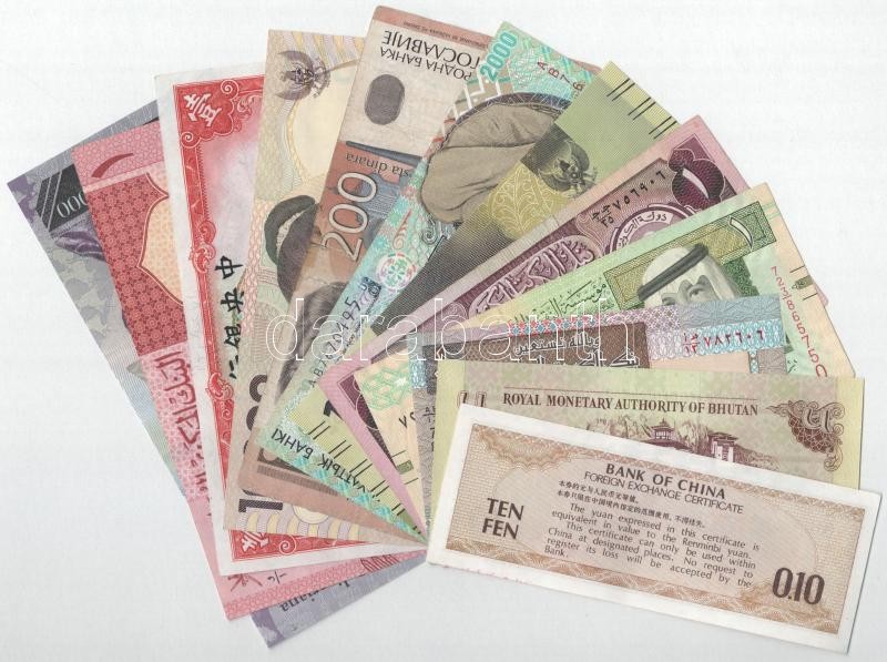 12xklf külföldi bankjegyből álló tétel, közte Omán, Kuvait, Szaúd-Arábia, Kína, stb. T:II-III- 12xdiff foreign banknote lot within Oman, Kuwait, Saudi Arabia, China, etc. C:XF-VG