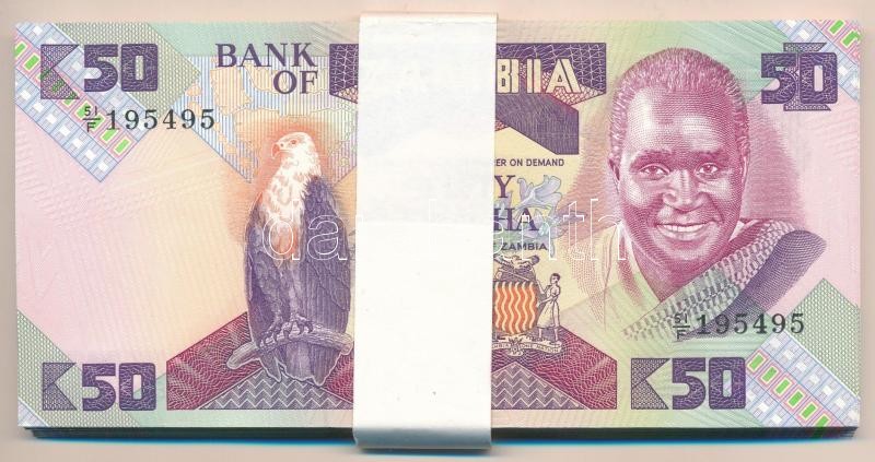 Zambia 1986-1988. 50 Kwacha (50x) in wrapper, consecutive serials C:UNC,AU