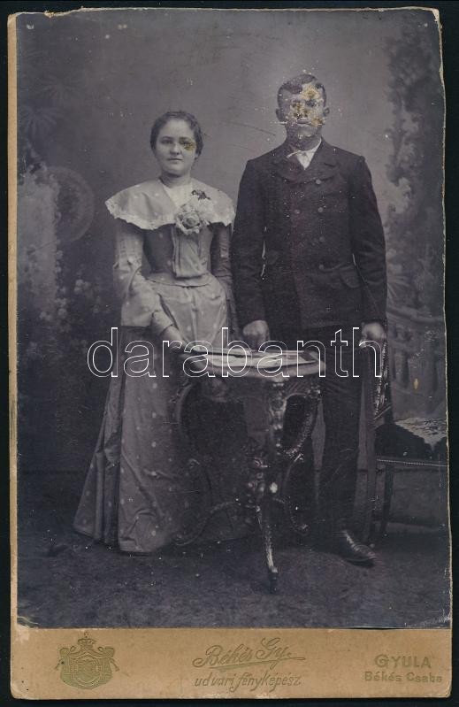 cca 1900 Fiatal házaspár portréja, keményhátú fotó Békés gyulai műterm...
