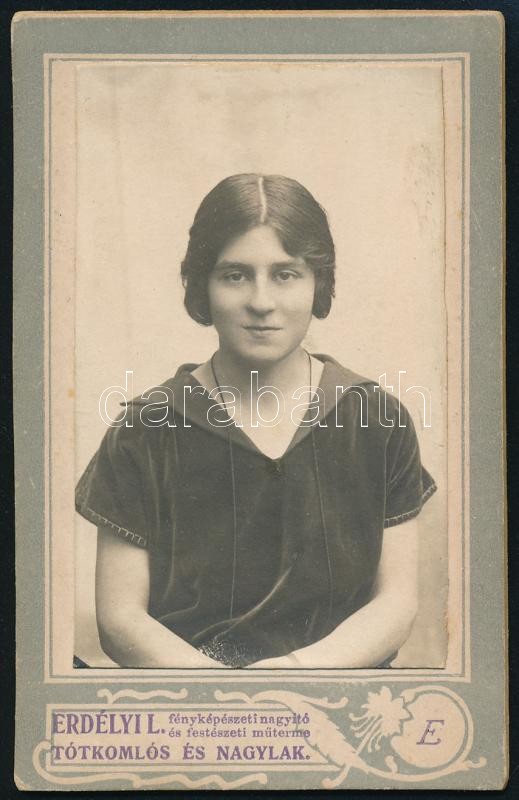 cca 1928 Hölgyportré, keményhátú fotó Erdélyi (Tótkomlós/Nagylak) műte...