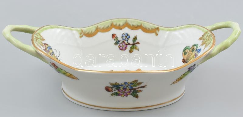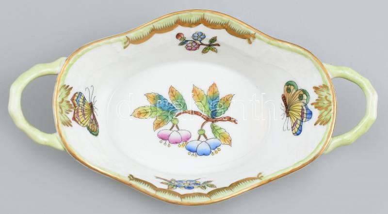 Herendi Viktória mintás porcelán füles tálka, kézzel festett, jelzett, kis kopásnyomokkal, 15,5×8,5 cm