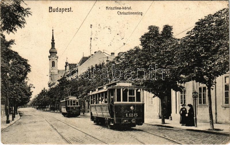 1907 Budapest I. Krisztina körút, villamosok, plébániatemplom (EB)