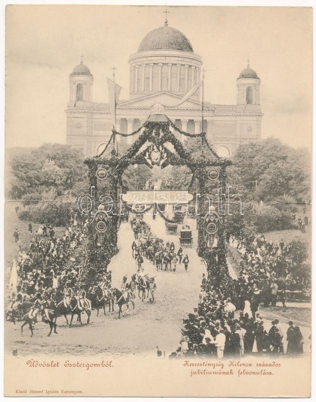 Description: Esztergom, Kereszténység kilenc százados jubileumának (1000-1900) felvonulása a Bazilika előtt. "Isten - Király - Haza" feliratos díszkapu. Stromf Ignác kiadása. Kihajtható képeslap (hajtásnál kicsit szakadt / slightly torn at fold)