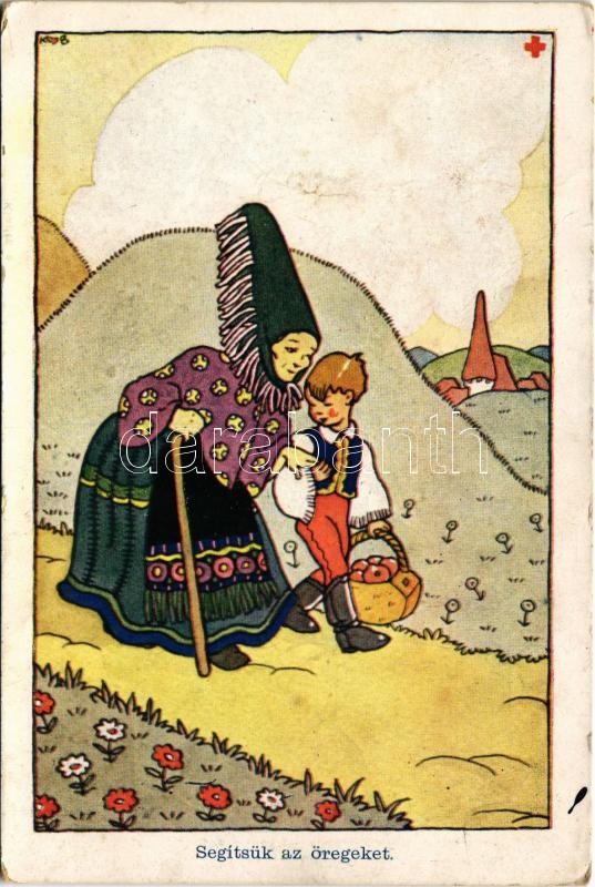 Segítsük az öregeket. Magyar Ifjúsági Vöröskereszt Egyesület kiadása / Hungarian Red Cross propaganda art postcard (gyűrődések / creases)