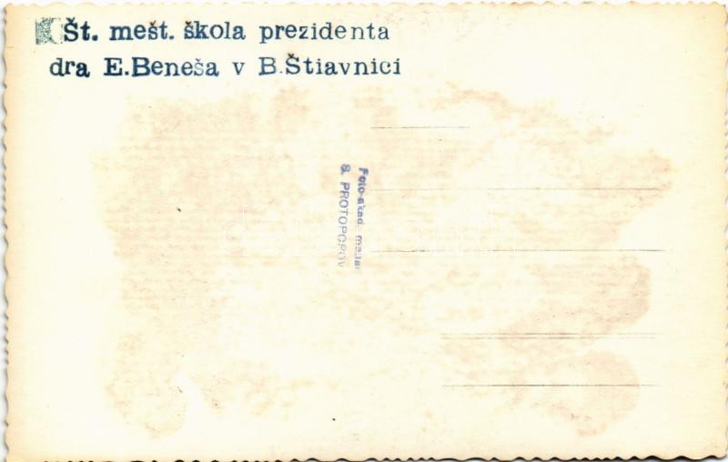 Description: Selmecbánya, Banská Stiavnica; St. mest. skola prezidenta dra E. Benesa v B. Stiavnici / iskola / school. S. Protopopov photo (ragasztónyom / glue mark)