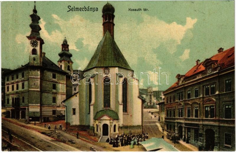 Selmecbánya, Schemnitz, Banská Stiavnica; Kossuth tér, Szent Katalin templom, Bányászati és Erdészeti Főiskola központi épülete, Ernst Zsigmond üzlete, piac, Hitelszövetkezet. Joerges kiadása 1908. / square, church, mining and forestry academy's central building, shops, market, credit union