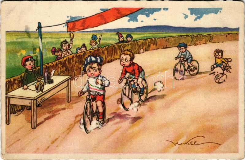 Olasz művészlap, gyerek kerékpár verseny, bicikli, sport / Italian art postcard, bicycle race. Degami 970. s: V. Castelli