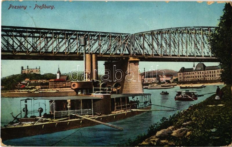 Description: 1912 Pozsony, Pressburg, Bratislava; Császári és Királyi Haditengerészet monitorja. Dunaflottilla / K.u.K. Kriegsmarine Donauflottille. Bediene dich allein / Austro-Hungarian Navy river guard monitor