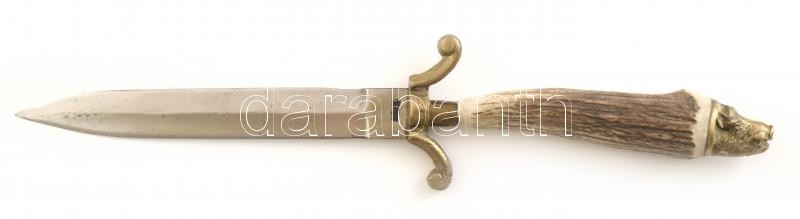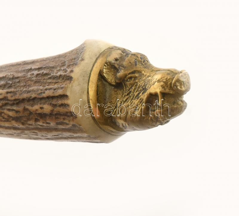 Agancsnyelű vadásztőr, vaddisznós réz véggel, Szám Kálmán késes mester munkája, jelzett, h: 36 cm