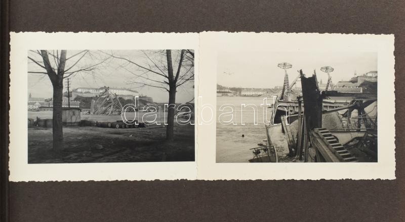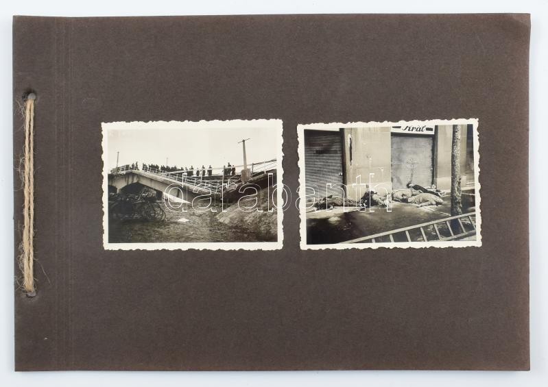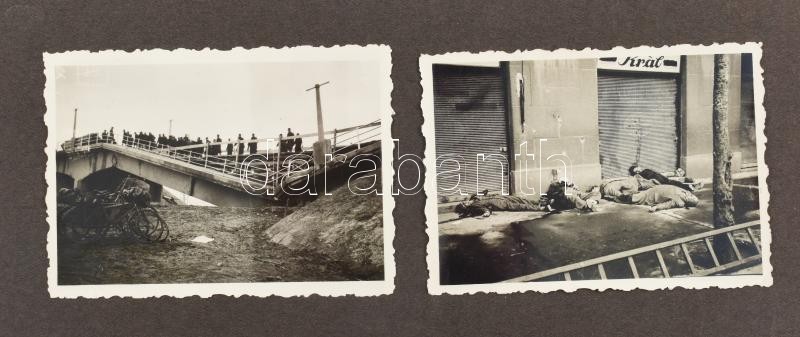 Description: 1941 Harctéri rombolások Újvidéken és környékén, a péterváradi híd romjai, civil halottak az újvidéki utcán és magyar katonai egységek fotói ugyanazon albumból, 24 db kartonra ragasztott fotó, jó állapotban, 6,5×9 cm