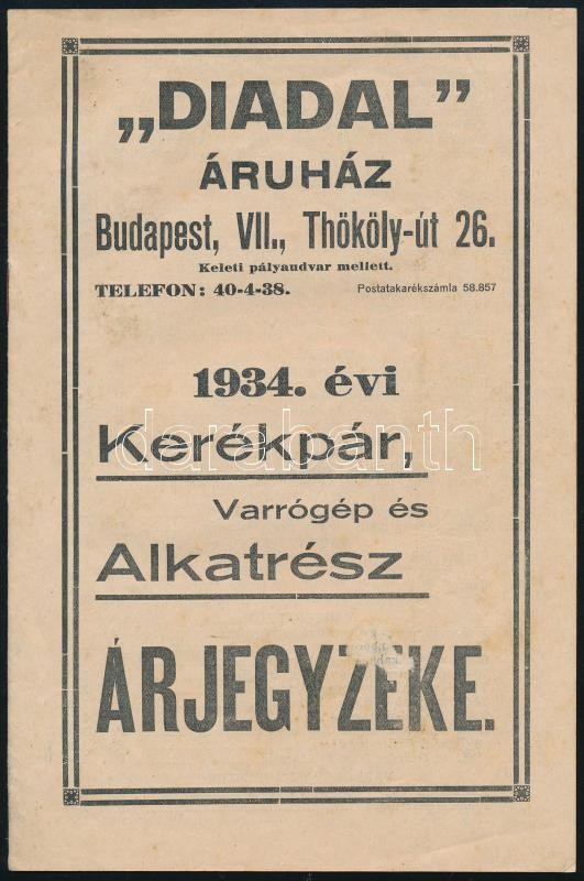 1934 Diadal Áruház, kerékpár, varrógép és alkatrész árjegyzéke,