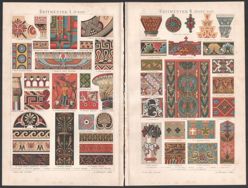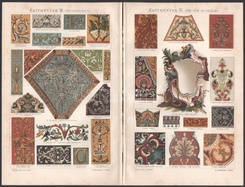 cca 1900 4 db Ékítmény témájú nyomat a Pallas Lexikonból. Lap széle ki...