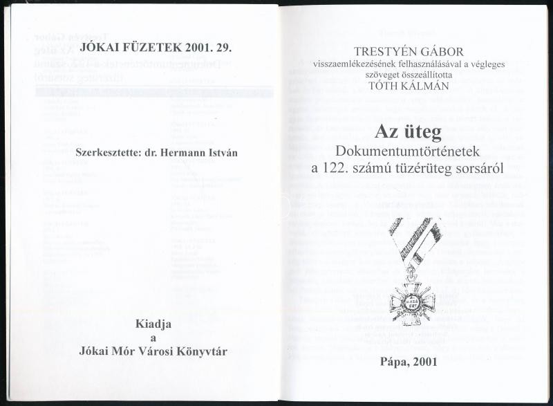 Description: Trestyén Gábor: Az üteg. Dokumentumtörtének a 122. számú tüzérüteg sorsáról. - - visszaemlékezések felhasználásával a végleges szöveget összeáll.: Tóth Kálmán. Jókai Füzetek 2001. 29. Pápa, 2001., Jókai Mór Városi Könyvtár. Kiadói papírkötés.