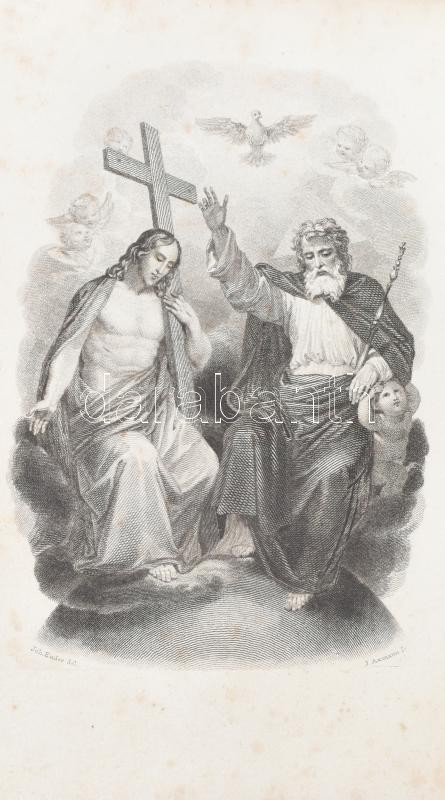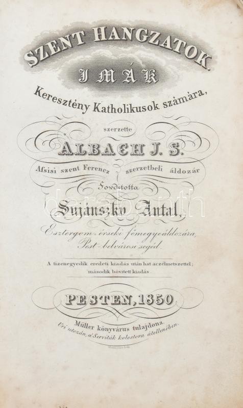 Albach J. S.: Szent hangzatok. Imák keresztény katholikusok számára. Assisi szent Ferencz szerzetbeli áldozár. Fordította Sujánszky Antal: Esztergomi-érseki főmegyeáldozása Pest-belvárosi segéd. A tizenegyedik eredeti kiadás után hat aczélmetszettel; második bővített kiadás. Pest., 1850., Müller, 1 (acélmetszetű címkép) t + 1 (acélmetszetű díszcímlap) t. +427+6 p.+4 (acélmetszetű képtáblák) t. Korabeli egészbőr-kötésben, aranyozott lapélekkel, fém kapcsokkal, kopott borítóval, sérült gerinccel, és kötéssel, javított kötéssel, egy-két kijáró lappal, kissé foltos lapokkal, bejegyzésekkel, megviselt állapotban.