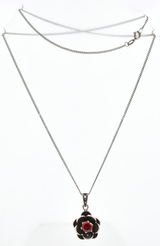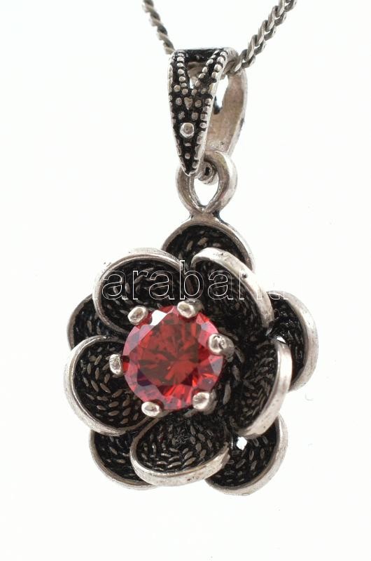 Ezüst(Ag) nyaklánc piros köves virágos medállal, jelzett, h: 50 cm, br...