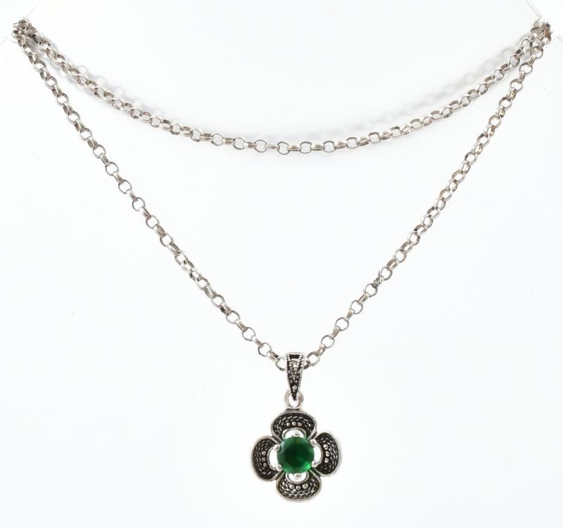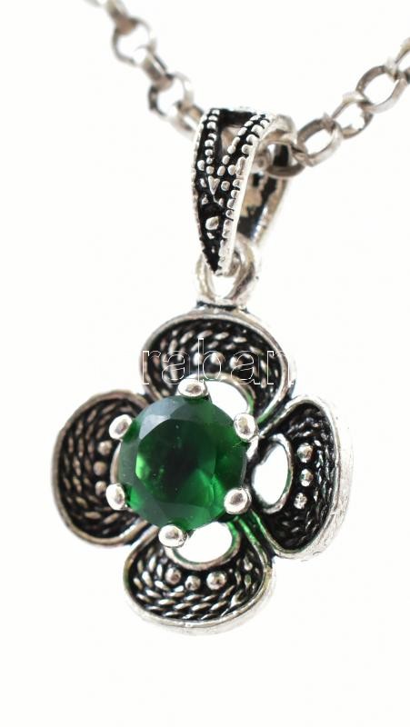 Ezüst(Ag) nyaklánc zöld köves virágos medállal, jelzett, h: 46 cm, bruttó: 6,4 g