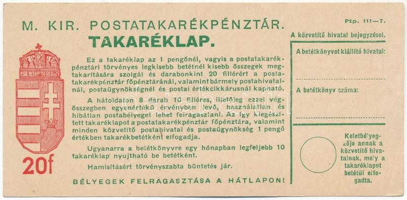 1926-1945. "M. Kir. Postatakarékpénztár" takaréklapja, kitöltetlen, bélyegek nélkül T:I-