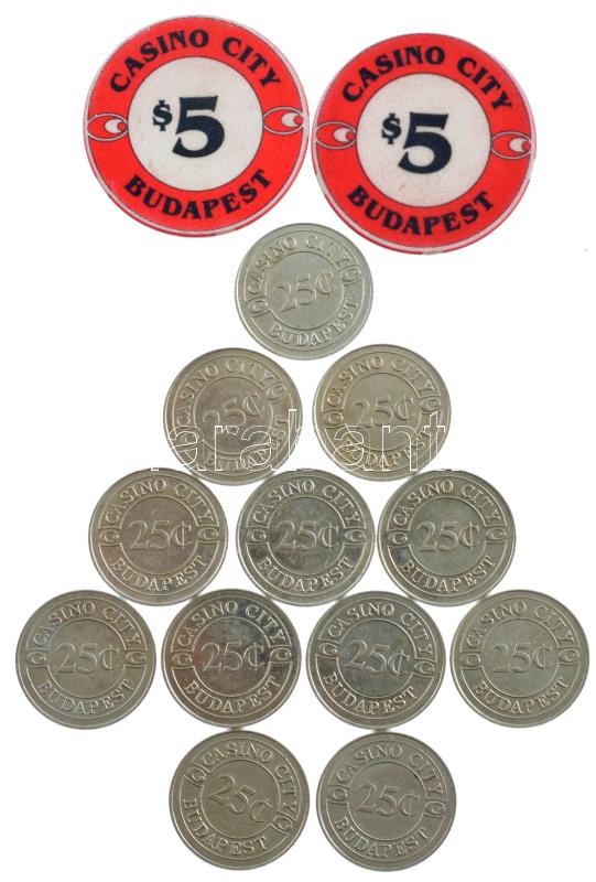 Casino City Budapest, 5$ műanyag zseton (2x) + 25c fém zseton (12x) T:...