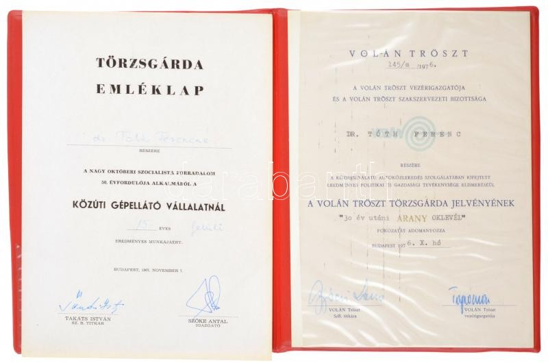 1967. "Közúti Gépellátó Vállalatnál 15. éves eredméynes munkáért" járó törzsgárda emléklap + 1976. "Volán Tröszt törzsgárda jelvényének '30 év utáni arany oklevél'" adományozói okirata műbőr tokban