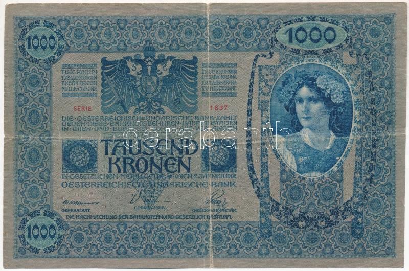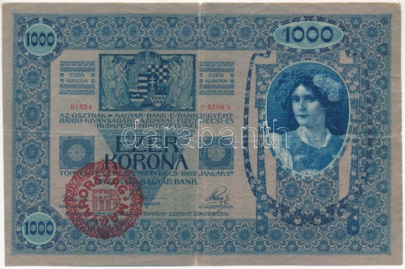 https://www.darabanth.com/en/419-Online-auction/419.0/Numismatics/Hungarian-Banknotes~2000008/1902-1000K-piros-MAGYARORSZAG-korbelyegzovel-TIII-szakadas-kis-anyaghiany-Adamo-SK35B~II2649838