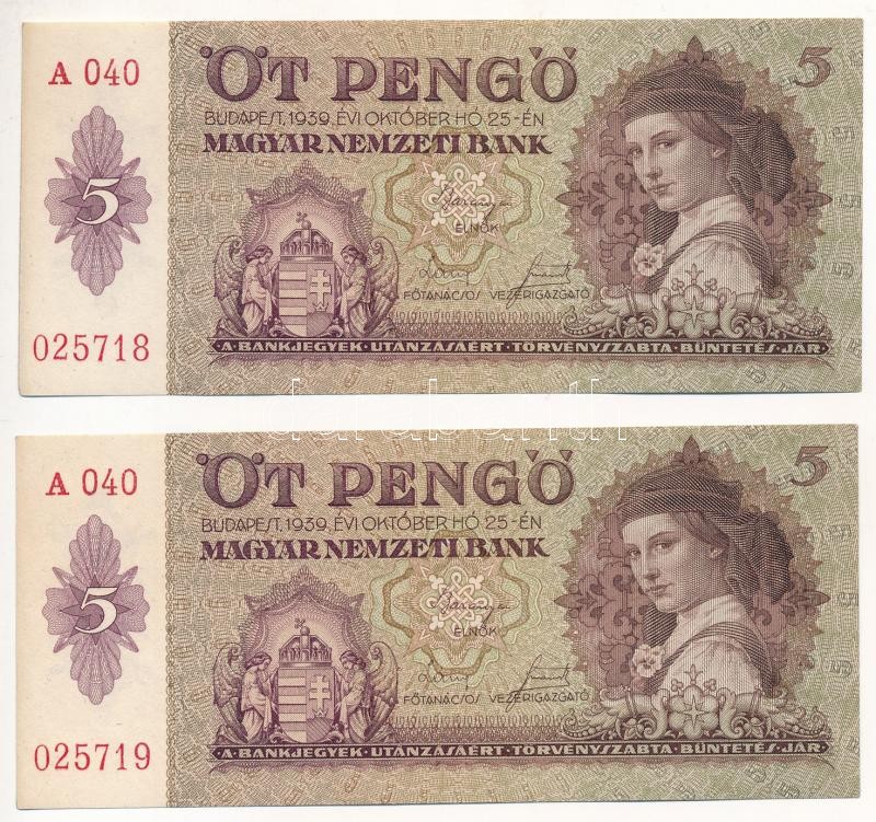 https://www.darabanth.com/en/419-Online-auction/419.0/Numismatics/Hungarian-Banknotes~2000008/1939-5P-2x-A-040-025718-19-sorszamkovetok-TI-a-szelek-kisse-megsargultak--Adamo-P6~II2644790