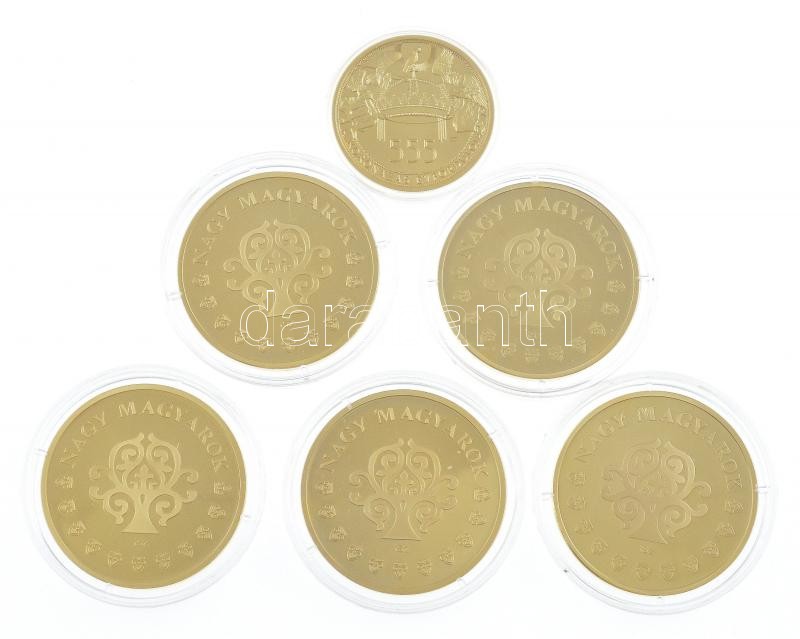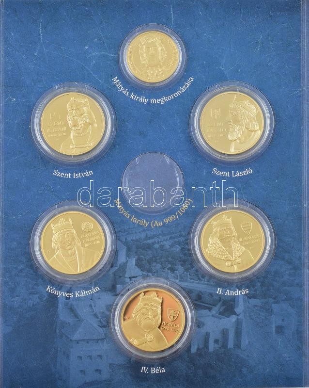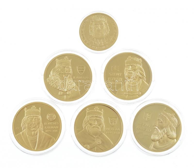 Description: ifj. Szlávics László (1959-) DN "Nagy Magyarok" 5xklf aranyozott Cu-Ni emlékérem (Szent István, Szent László, Könyves Kálmán, II. András, IV. Béla) + 2019. "Hunyadi Mátyás 1464-1490. / A koronázás 555. évfordulója" aranyozott Cu-Ni emlékérem, "Királyok hazája" gyűjtői mappában, tanúsítványokkal, valamint tulajdonosi tanúsítvánnyal T:PP