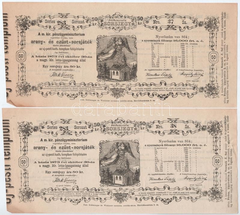 Description: Budapest / Pest 1873. "Jótékonyczélú Sorsjegy - Az uj-pesti kath. templom felépítésére" 50kr értékű sorsjegy (2x) sorszámkövetők T:I- kis szamárfül és szakadás