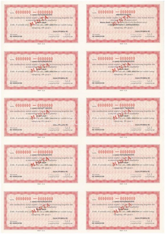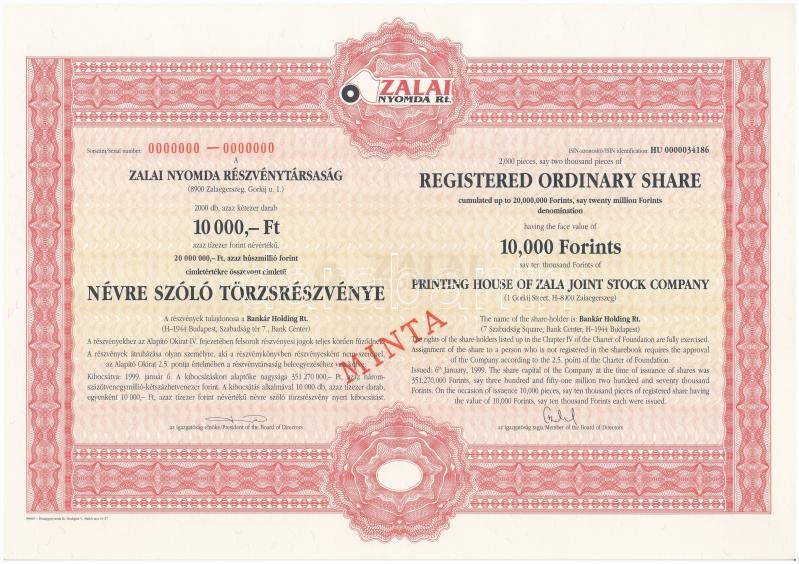 Debrecen 1995. "Debreceni Hús Részvénytársaság" 100db törzsrészvénye összesen 1.000.000Ft-ról, szelvényekkel, "MINTA" felülbélyegzéssel + 1999. "Zalai Nyomda Részvénytársaság" 2000db névre szóló törzsrészvénye egyben, egyenként 10.000Ft-ról, kétnyelvű, "MINTA" bélyegzéssel, szelvényekkel T:I,I-