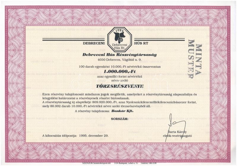Debrecen 1995. "Debreceni Hús Részvénytársaság" 100db törzsr...