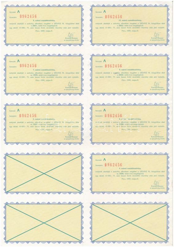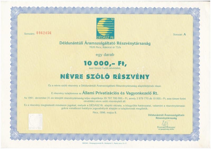 Pécs 1996. "Déldunántúli Áramszolgálgáltató Részvénytársaság" részvénye 10.000Ft-ról szelvényekkel T:II