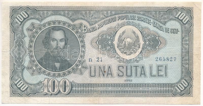 Romania 1952. 100 Lei "N21 265827" C:F small tear, spot