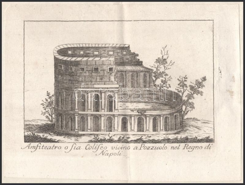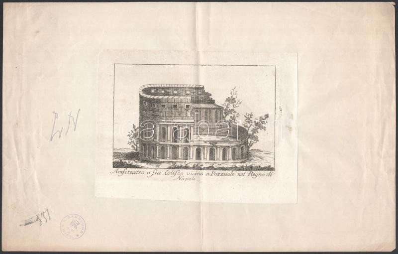 Római kori amfiteátrum látképe a Nápolyi Királyság területén. Rézmetszet, papír, jelzés nélkül. hajtásnyommal, papírra kasírozva. 9x13 cm