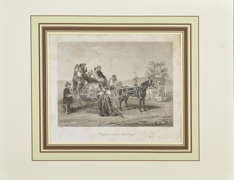 Description: William French (1815-1898) metszése, Peingret után: Nápolyi bérkocsi (Napolitanischer Miethwagen). Acélmetszet, papír. Jelzett a metszeten. Kissé foltos. Paszpartuban. 15x20,5 cm.
