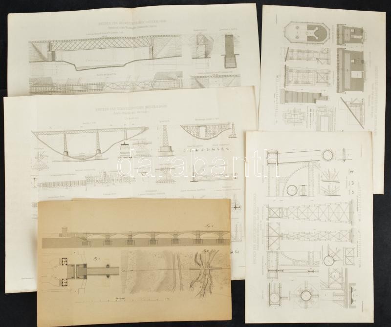 cca 1880 Hidakat, vasúti és Duna-hidakat ábrázoló nagy méretű tervrajz metszetek 6 db 45x60 cm és 45x30 cm