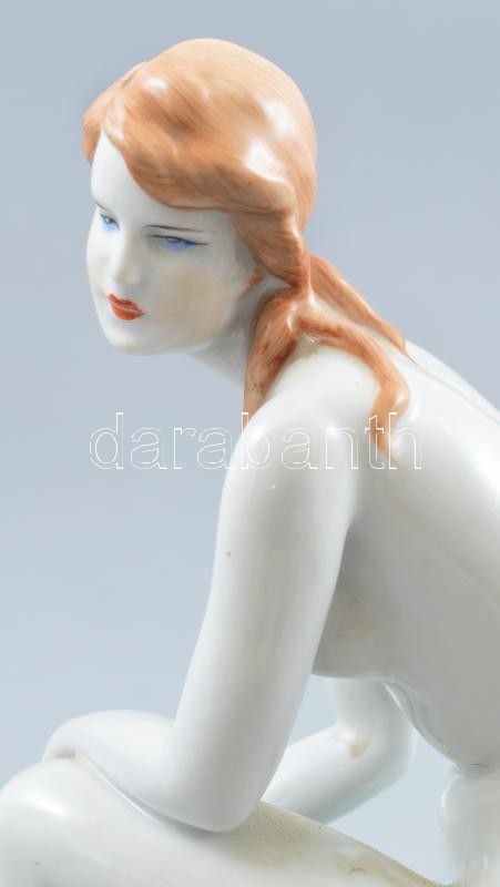 Zsolnay térdelő akt, kézzel festett, jelzett, hibátlan, m: 23cm