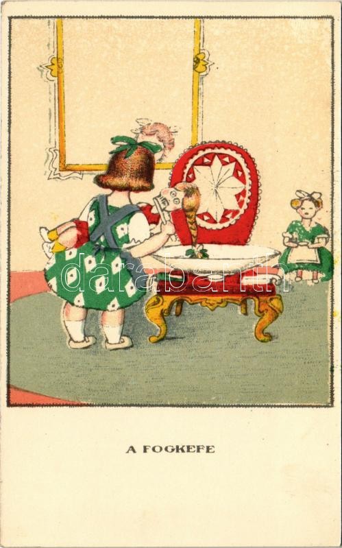 Fogkefe. Egy jó kislány viselt dolgai I. sorozat 1. szám / Toothbrush. Hungarian art postcard s: Kozma Lajos