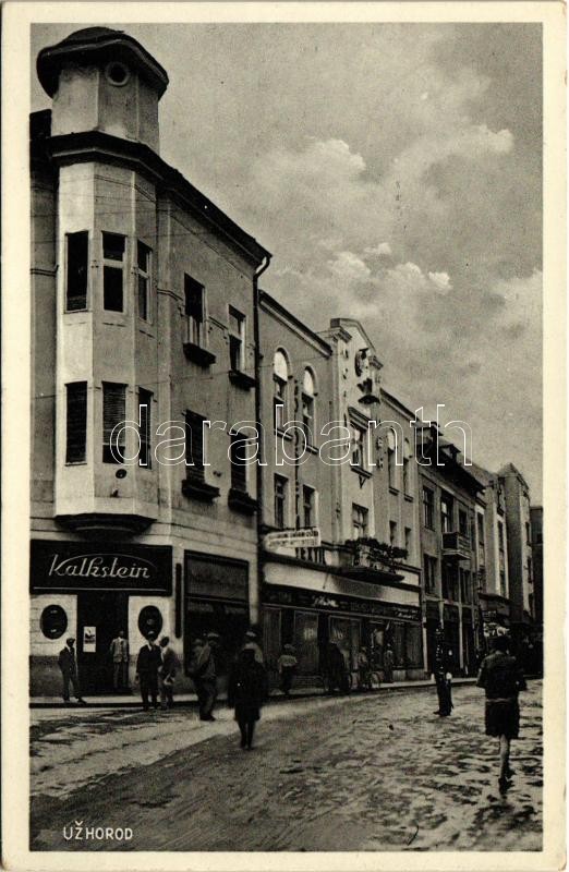1934 Ungvár, Uzshorod, Uzhhorod, Uzhorod; Dr. Rasin utca, Kalkstein üzlete. Brody és Gottlieb kiadása / Ulice dra. Rasinova / street view, shops