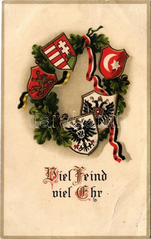 Viel Feind Viel Ehr! / Első világháborús propaganda a Központi hatalma... https://www.darabanth.com/en/419-Online-auction/419.0/Postcards/Flags-Coat-of-Arms~1500082/Viel-Feind-Viel-Ehr-Elso-vilaghaborus-propaganda-a-Kozponti-hatalmak-cimereivel-WWI-Centr~II2647523