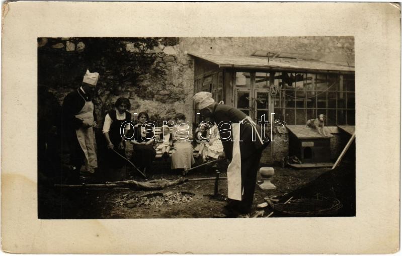 1913 Magyar folklór, sütögetés az udvaron / Hungarian folklore, grilling in the yard. photo (fl)