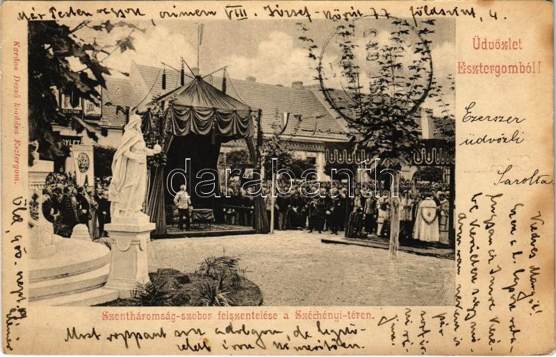 1900 Esztergom, Szentháromság szobor felszentelése a Széchenyi téren. Kardos Dezső kiadása (EK)